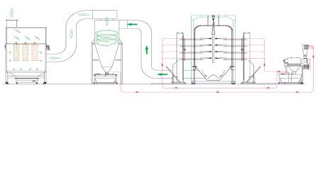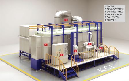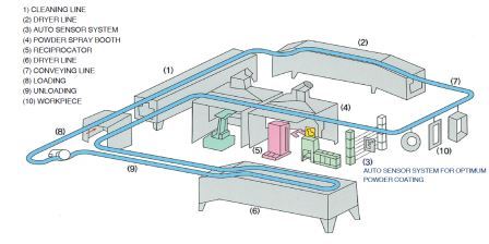 קו צביעה אוטומטי באבקה כולל: בדרך כלל את היחידות הבאות או חלק מהם וניתן להוסיף עוד שכלולים.